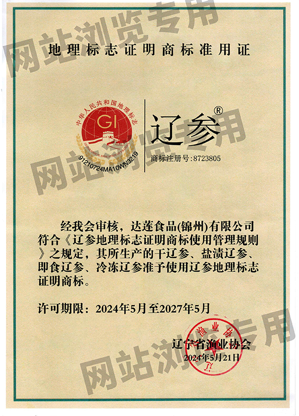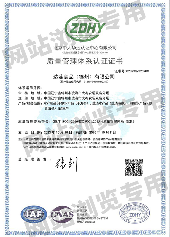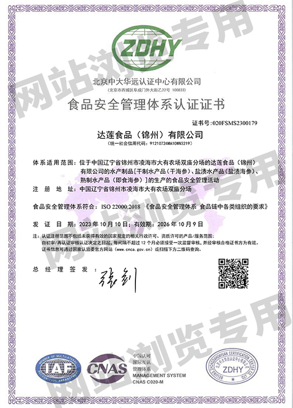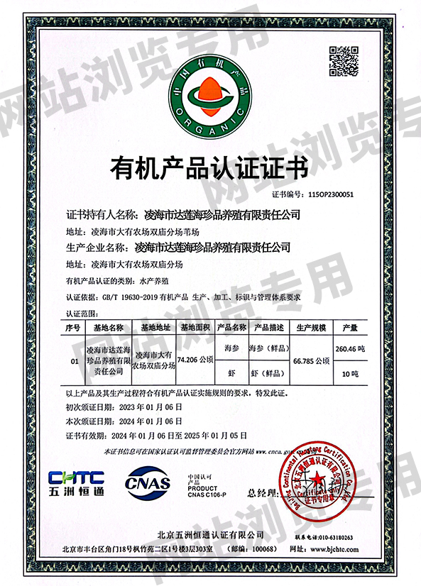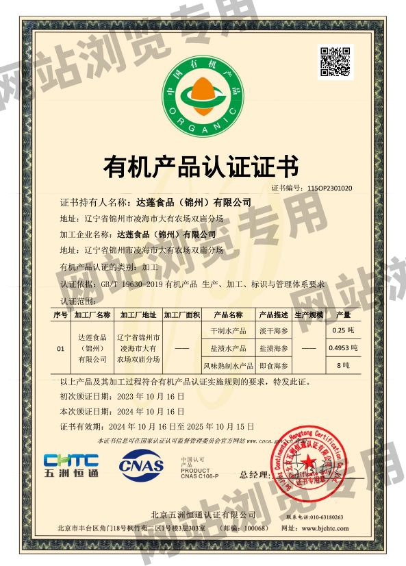 達(dá)蓮公司的遼參產(chǎn)品通過養(yǎng)殖、加工雙有機(jī)產(chǎn)品認(rèn)證、遼參認(rèn)證、ISO9001質(zhì)量管理體系要求認(rèn)證ISO22000食品安全管理體系、食品鏈中各類組織的要求認(rèn)證、HACCP危險分析與關(guān)鍵控制點(diǎn)認(rèn)證等。